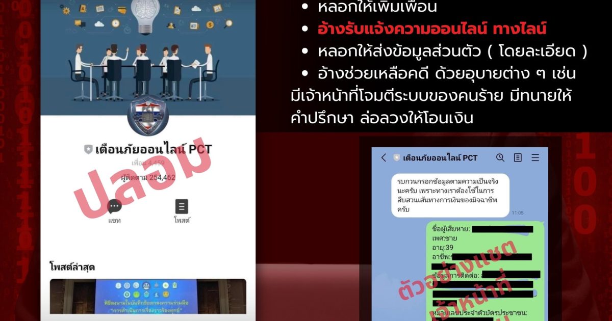 มิจฉาชีพทำขึ้นมาหลอกลวง อ้างเตือนภัยออนไลน์ ตำรวจ PCT หลอกซ้ำเหยื่อโจรออนไลน์ ทำทีรับแจ้งความออนไลน์ ช่วยเหลือคดี ( ทางไลน์ ) แต่ลงท้ายหลอกขโมยข้อมูล ล่อลวงให้โอนเงิน