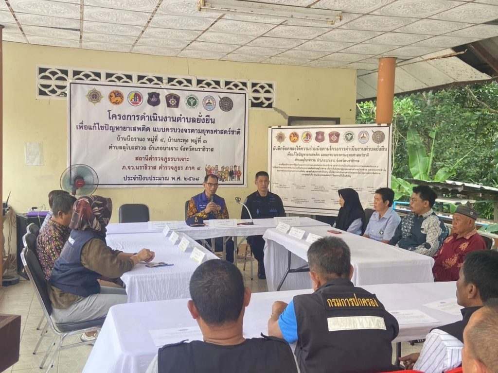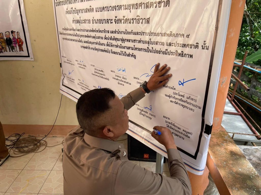 ณ ศูนย์ปฏิบัติการตำบลยั่งยืน ม.4 ต.ลุโบะสาวอ อ.บาเจาะ จว.นราธิวาส โดยได้ร่วมกันลงนามบันทึกข้อตกลง MOU เพื่อแสดงถึงเจตนารมณ์ อันมุ่งมั่นตั้งใจที่จะร่วมกันแก้ไขปัญหายาเสพติด ให้ปรากฎผลอย่างเป็นรูปธรรม และยั่งยืนตลอดไป