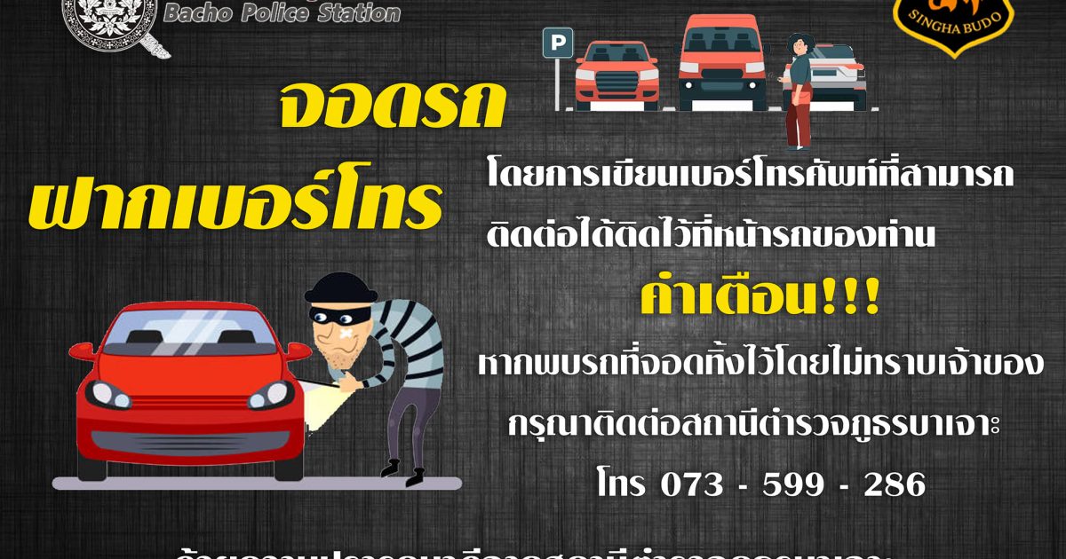 หากท่านพบรถที่จอดทิ้งไว้ในลักษณะที่น่าสงสัย โดยไม่ทราบเจ้าของหรือติดต่อเจ้าของรถไม่ได้ กรุณาติดต่อ สภ.บาเจาะ 073599286