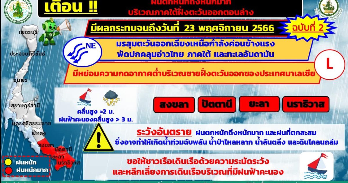 ช่วงเช้าวันนี้ (20 พ.ย. 66) นายกมล พรหมสาขา ณ สกลนคร ผู้อำนวยการศูนย์อุตุนิยมวิทยาภาคใต้ฝั่งตะวันออก เปิดเผยว่า ศูนย์อุตุนิยมวิทยาภาคใต้ฝั่งตะวันออก ได้ออกประกาศเตือนฉบับที่ 2 (70/2566) เรื่อง “ฝนตกหนักถึงหนักมากบริเวณภาคใต้ฝั่งตะวันออกตอนล่าง” (มีผลกระทบจนถึงวันที่ 23 พฤศจิกายน 2566) โดยมรสุมตะวันออกเฉียงเหนือกำลังค่อนข้างแรงพัดปกคลุมอ่าวไทย ภาคใต้ และทะเลอันดามัน ประกอบกับมีหย่อมความกดอากาศต่ำบริเวณชายฝั่งตะวันออกของประเทศมาเลเซีย ลักษณะเช่นนี้ทำให้บริเวณภาคใต้ฝั่งตะวันออกตอนล่างยังคงมีฝนตกต่อเนื่อง และมีฝนหนักถึงหนักมากบางแห่ง บริเวณจังหวัดสงขลา ปัตตานี ยะลา และนราธิวาสจนถึงวันที่ 23 พฤศจิกายน 2566 ขอให้ประชาชนในพื้นที่เสี่ยงภัยยังคงระวังอันตรายที่เกิดจากฝนตกหนักถึงหนักมาก และฝนที่ตกสะสม ซึ่งอาจทำให้เกิดน้ำท่วมฉับพลัน น้ำป่าไหลหลาก น้ำล้นตลิ่ง และดินโคลนถล่ม สำหรับคลื่นลมบริเวณอ่าวไทยจะมีกำลังค่อนข้างแรง ทะเลมีคลื่นสูงประมาณ 2 เมตร บริเวณที่มีฝนฟ้าคะนองทะเลมีคลื่นสูงมากกว่า 3 เมตร ขอให้ชาวเรือเดินเรือด้วยความระมัดระวัง และหลีกเลี่ยงการเดินเรือบริเวณที่มีฝนฟ้าคะนอง จึงขอให้ประชาชนติดตามข่าวพยากรณ์อากาศจากศูนย์อุตุนิยมวิทยาภาคใต้ฝั่งตะวันออกอย่างใกล้ชิด
