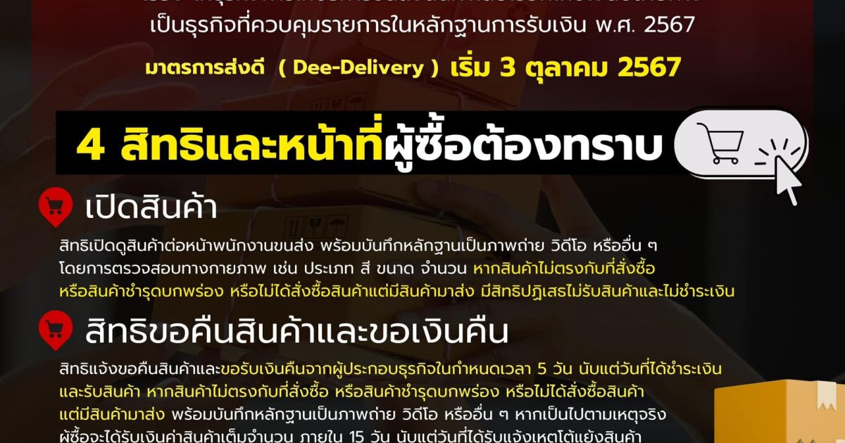 ให้สิทธิและหน้าที่ผู้ซื้อและ ผู้ให้บริการขนส่ง ป้องกันการหลอกลวงขายสินค้า ซึ่งเป็นภัยออนไลน์ ที่พบการแจ้งความผ่านระบบรับแจ้งความออนไลน์ www.thaipoliceonline.go.th มากที่สุด