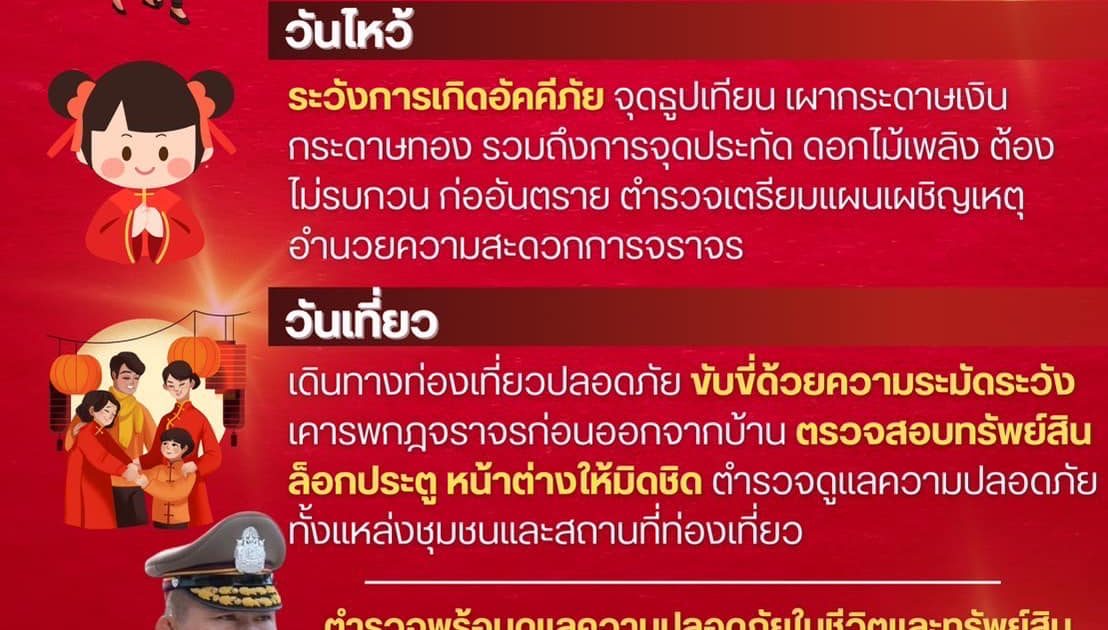 ระมัดระวังในการจุดไฟ ธูป เทียน เผากระดาษเงินกระดาษทอง หลีกเลี่ยงการจุดประทัด ดอกไม้เพลิง ในลักษณะที่อาจก่ออันตรายและสร้างความรำคาญแก่ผู้อื่น ทั้งนี้ หากต้องการขอความช่วยเหลือ หรือแจ้งเหตุ สามารถแจ้งมายังเจ้าหน้าที่ตำรวจในพื้นที่ใกล้เคียง หรือโทรศัพท์สายด่วน 191 และ 1599 หากถูกหลอกลวงทางออนไลน์ โทร.1441เพื่อระงับ อายัดเงิน ตลอด 24 ชั่วโมง หรือ แจ้งความออนไลน์ ที่ www.thaipoliceonline.go.th