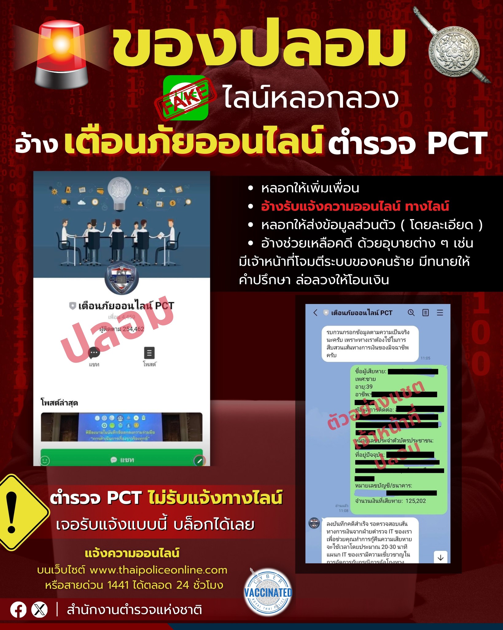 ของปลอม อย่าเชื่อ อ้าง ตำรวจ PCT รับแจ้งความทางไลน์ ( LINE ) มิจฉาชีพทำขึ้นมาหลอกลวง อ้างเตือนภัยออน