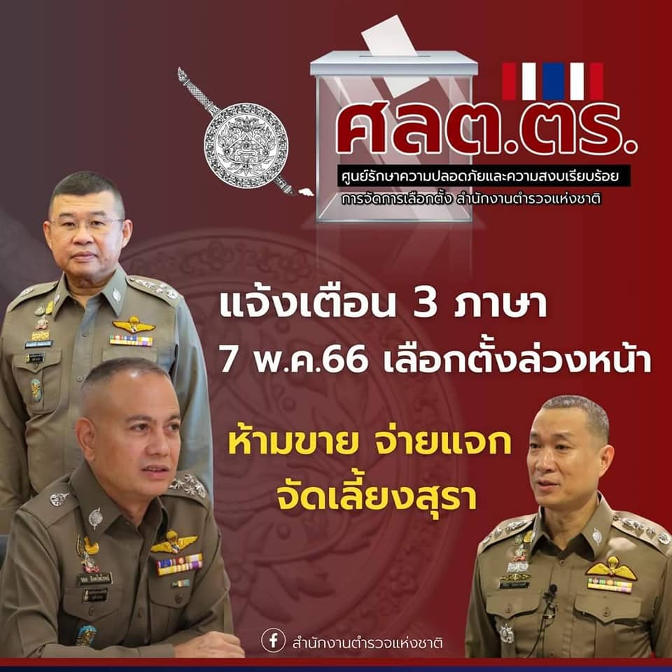“ศลต.ตร.” แจ้งเตือน 3 ภาษา 7 พ.ค. เลือกตั้งล่วงหน้า ห้ามจำหน่าย จ่ายแจก จัดเลี้ยงสุราทุกชนิด ทั่วประ