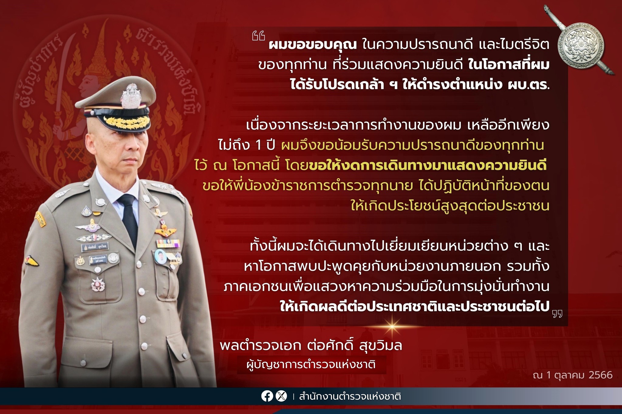 “พล.ต.อ.ต่อศักดิ์ สุขวิมล ผบ.ตร.” ขอบคุณทุกท่านที่ร่วมแสดงความยินดี ให้โอกาสได้รับโปรดเก