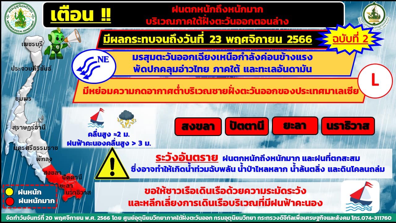 อุตุฯ เตือนต่อเนื่องฝนตกหนักถึงหนักมากบริเวณภาคใต้ฝั่งตะวันออกตอนล่าง (มีผลกระทบจนถึง 23 พ.ย.66) ขณะ